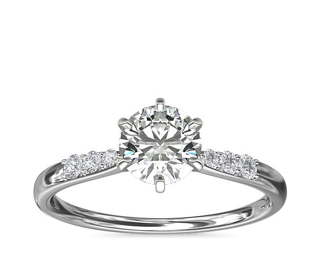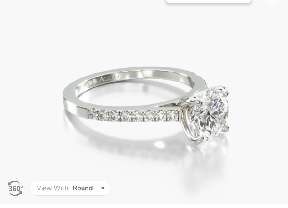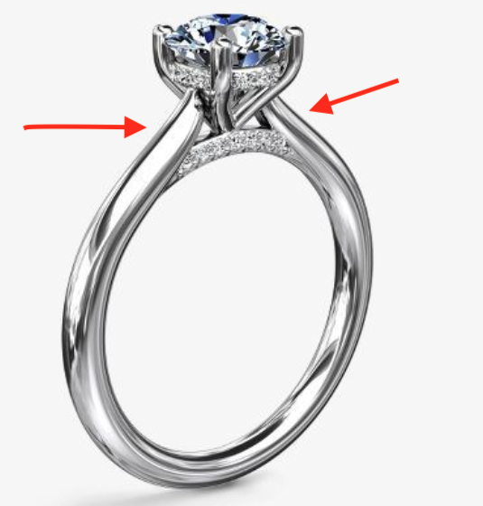 A cathedral ring setting is a type of setting that features two “wings” that extend from either side of the center diamond or gemstone, like these rings from James Allen and Blue Nile. The wings are usually set with diamonds and can be plain or embellished with diamonds or engravings. This setting gives the ring a regal, elegant look, and is a popular choice for engagement rings. The cathedral setting is also known as a “raised” setting.
