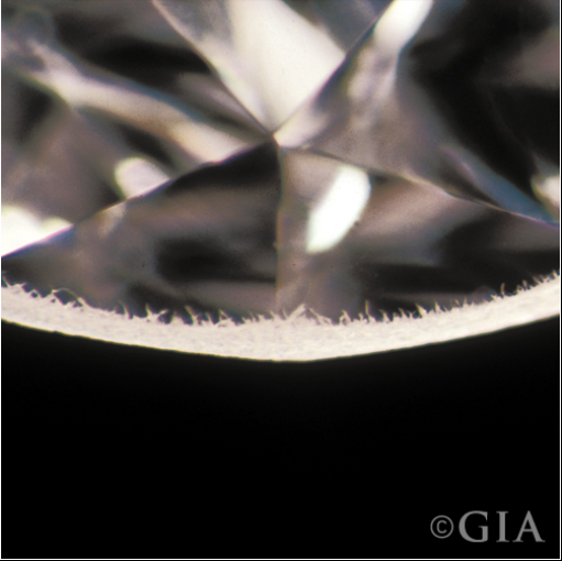 A “rough” girdle. Generally a series of minute feathers at the girdle that often result during the cutting process.