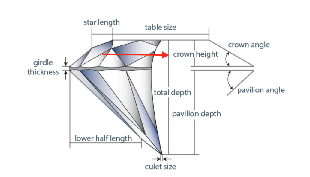 The crown height of a diamond is the vertical measurement from the table (the flat top facet) to the girdle, which is the outer edge where the top (crown) and bottom (pavilion) portions of the diamond meet. It represents the height of the diamond's upper section, also known as the crown. Crown height is an important factor in assessing a diamond's proportions and overall cut quality. Along with other measurements such as table size, pavilion depth, and angles, the crown height influences how light interacts with the diamond. Well-proportioned crown height contributes to optimal light reflection, dispersion, and brilliance, enhancing the diamond's visual appeal.Different diamond cuts may have variations in crown height based on the overall design, and assessing this measurement is crucial when evaluating a diamond's quality and aesthetics.