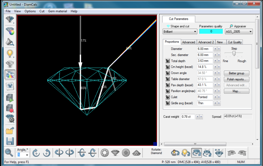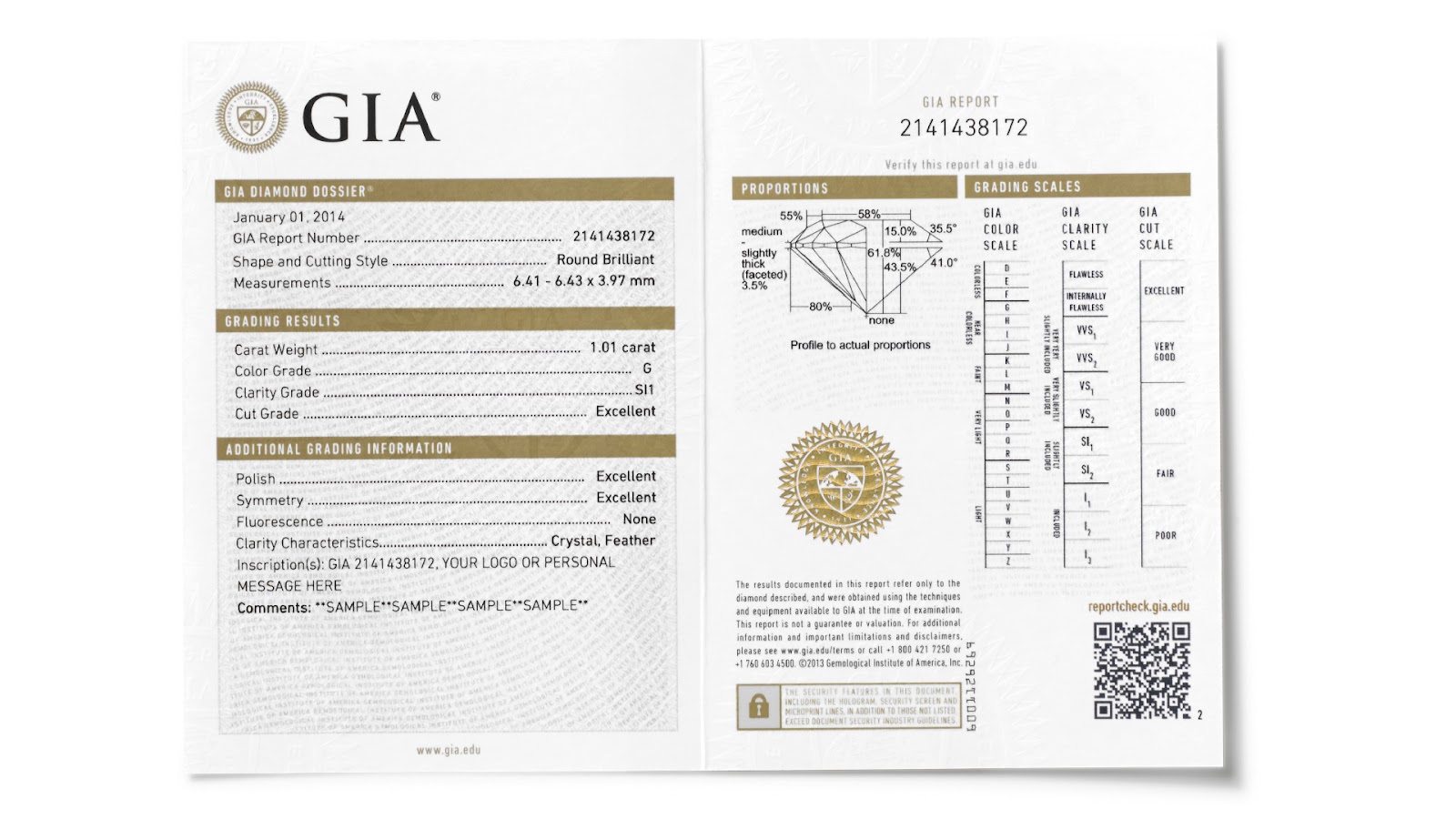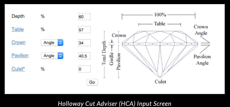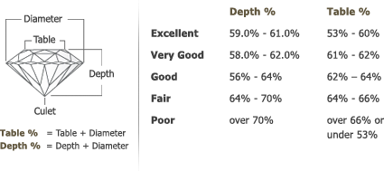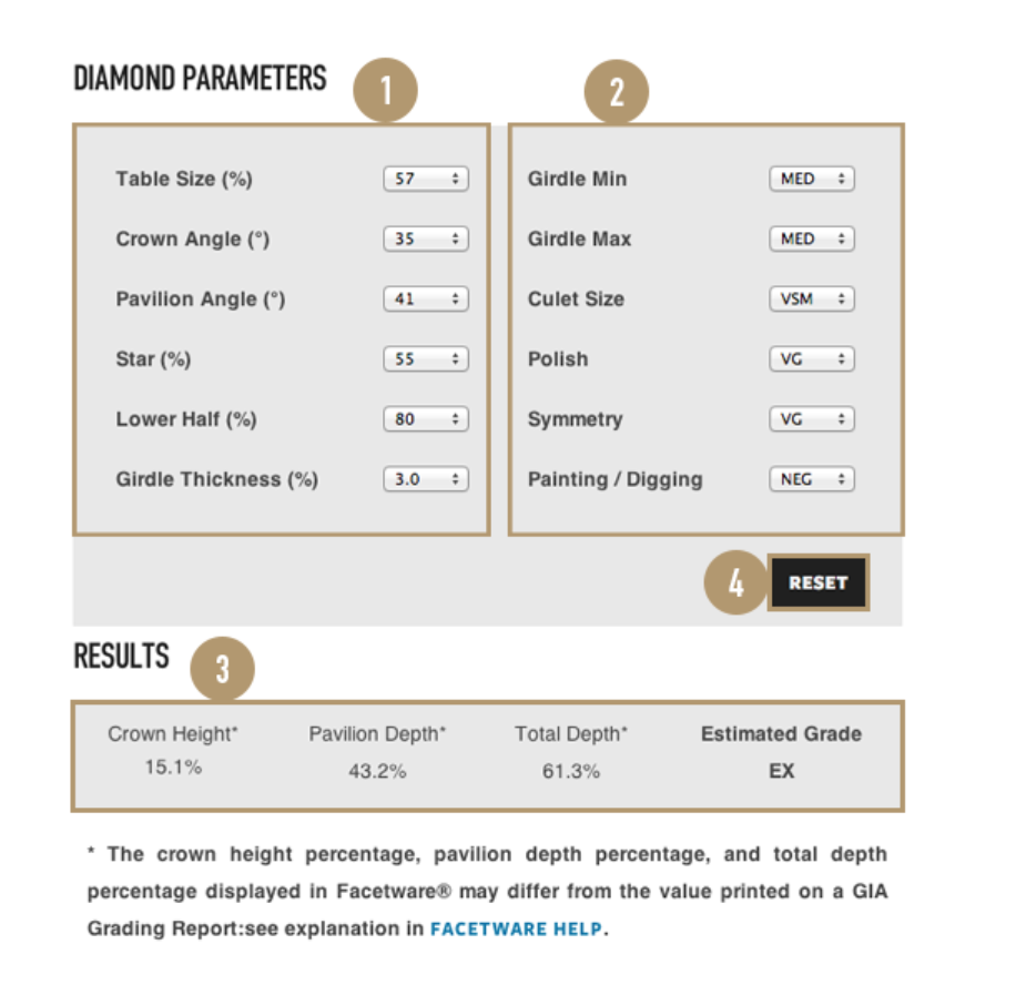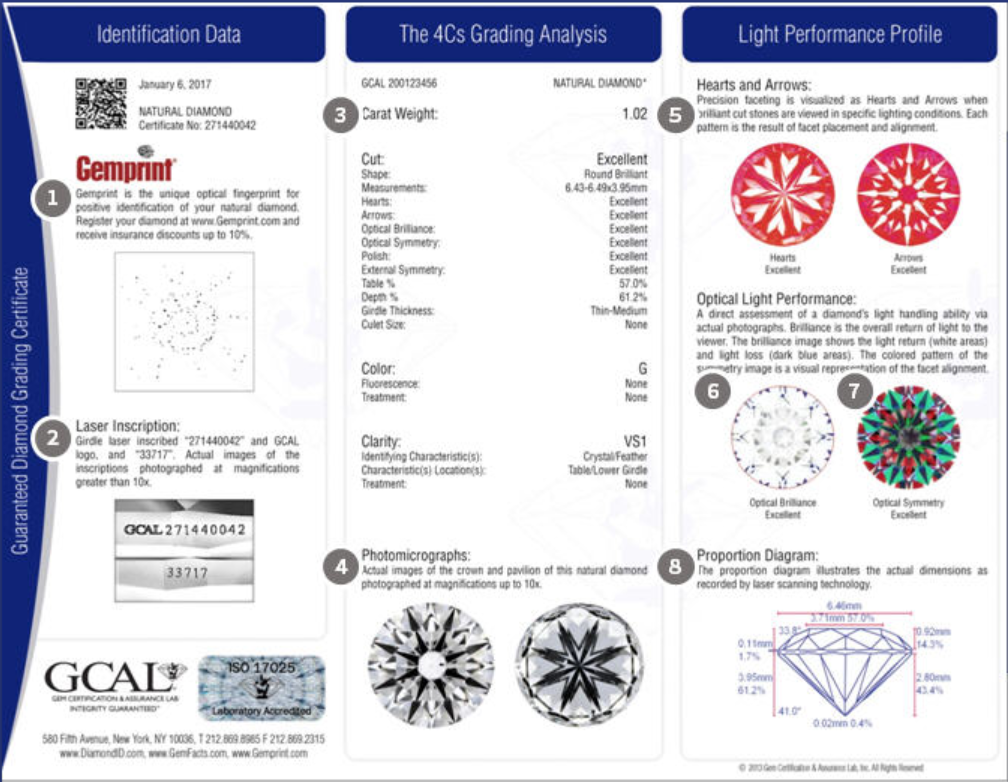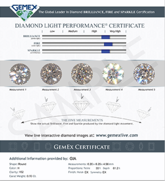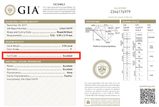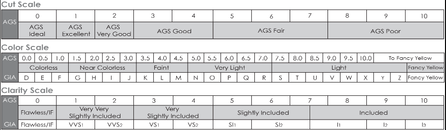 Evaluation is done on a 0-10 scale with 0 being ideal, or “zero deductions”. In addition to cut quality, color and clarity are also graded on the numerical scale but the GIA equivalents are also stated on the report. See also Triple Zero.