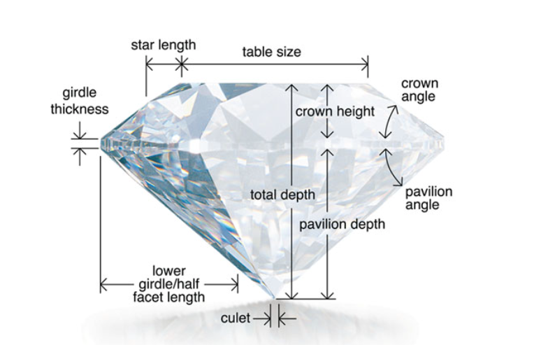The culet is the small facet at the bottom of a diamond's pavilion (bottom portion). It is essentially a point or a tiny facet that may be present or absent. The culet can impact the appearance of a diamond, especially in terms of light reflection. A well-proportioned culet contributes to the diamond's brilliance, while a large or noticeable culet might affect its overall visual appeal. Culets are graded from "None" to "Large" based on their size and visibility.