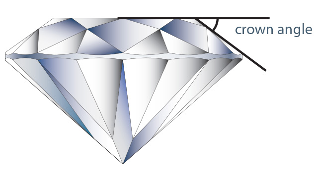 The crown angle on a diamond refers to the angle between the girdle plane (the widest part of the diamond) and the bezel facets of the crown (the upper part of the diamond, above the girdle). Specifically, it is the angle formed by the line of the girdle and the line of the crown facets when viewed from the side of the diamond.The crown angle is one of the measurements used to assess the diamond's cut quality. It, along with other factors like table percentage and pavilion angle, influences how light interacts with the diamond. Well-proportioned crown angles contribute to optimal light reflection, dispersion, and brilliance, resulting in a diamond with attractive visual characteristics.