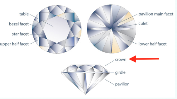 The area located above the girdle and below the table of a diamond. Generally all diamonds worn today have a crown they are not “flat”.
