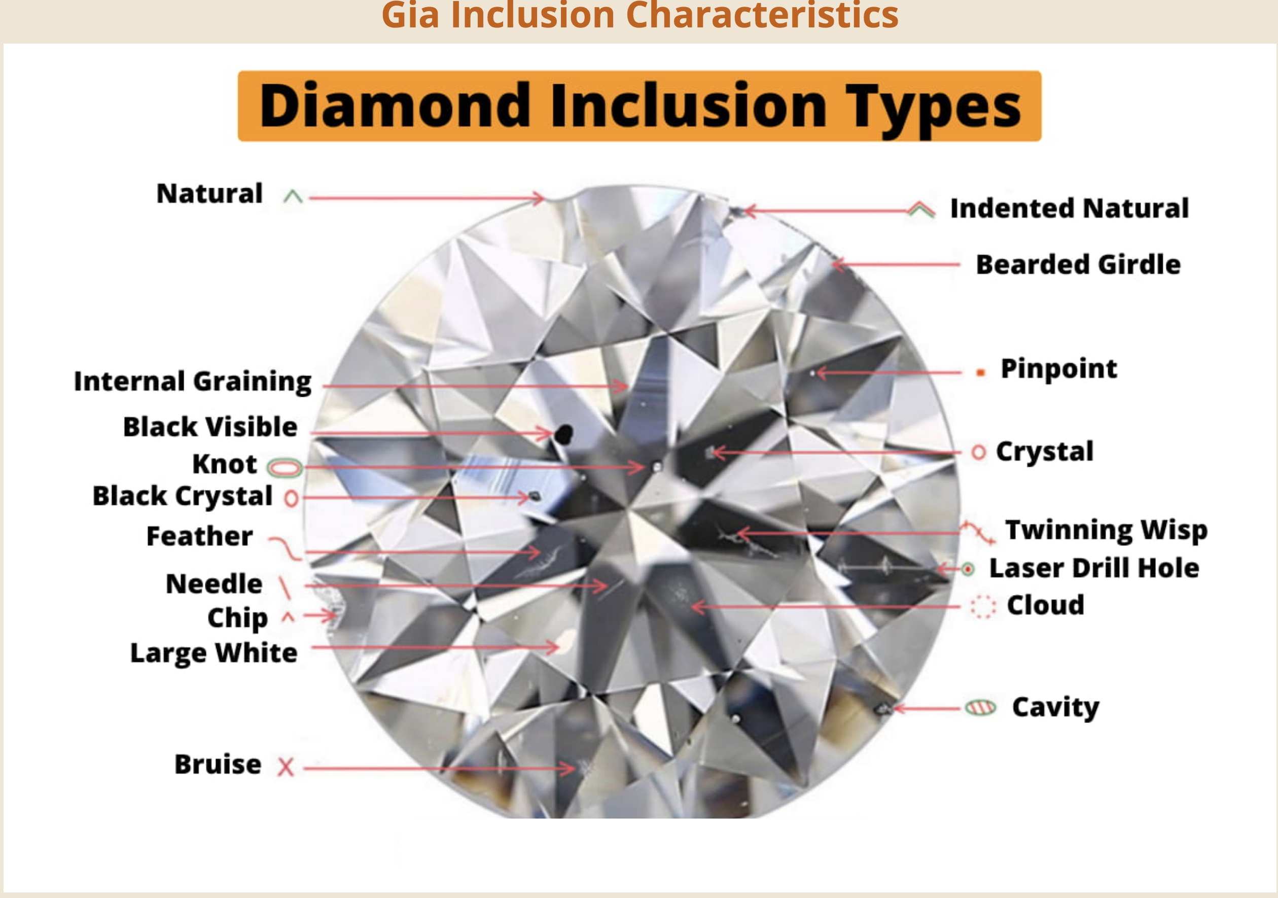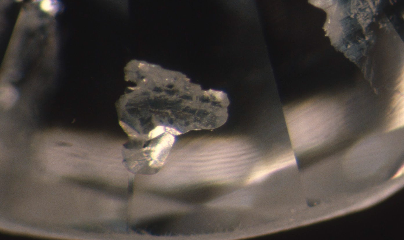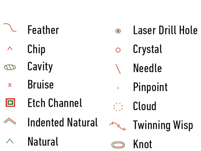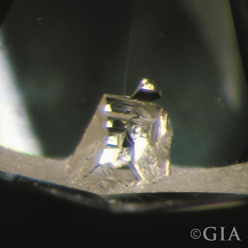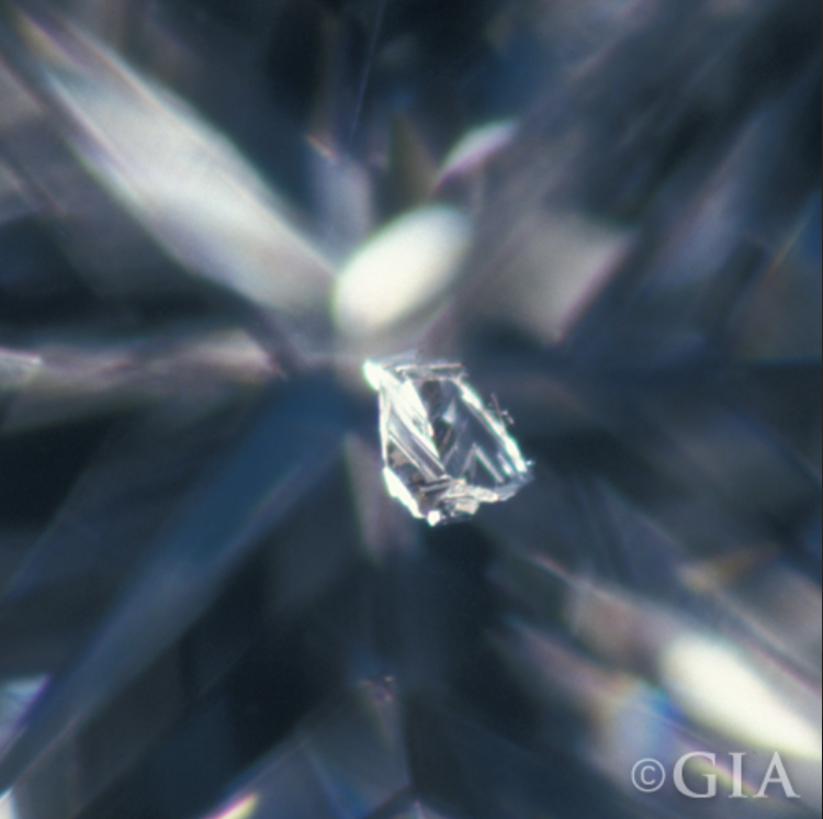 Is a type of imperfection that exists in many diamonds. Often the color is black(a negative as it is more likely to be seen with the naked eye). Depending on the color, location and size of the imperfection, pricing for a similar graded stone may vary greatly. Indication of a “Crystal” will appear in the Key-to-Symbols area of the GIA grading report.