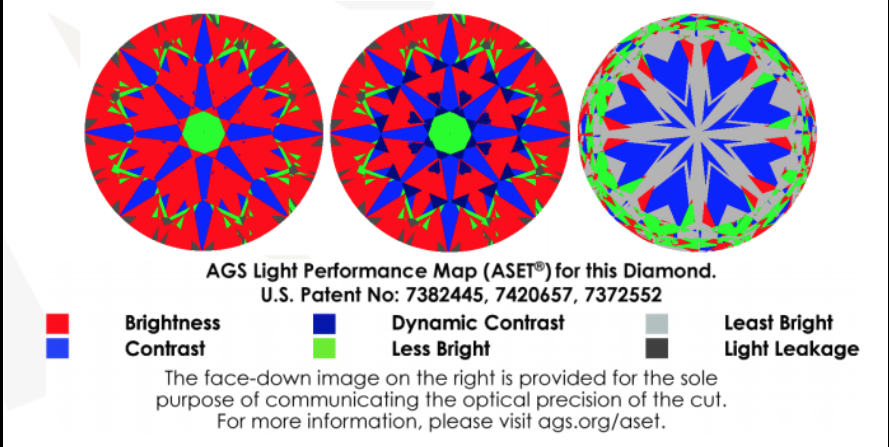 ASET Angular Spectrum Evaluation Tool, the graphical foundation of the AGS light performance cut grading system. A simple hand-held reflector device can be used to assess light return, contrast and leakage in loose diamonds and diamonds set in jewelry.