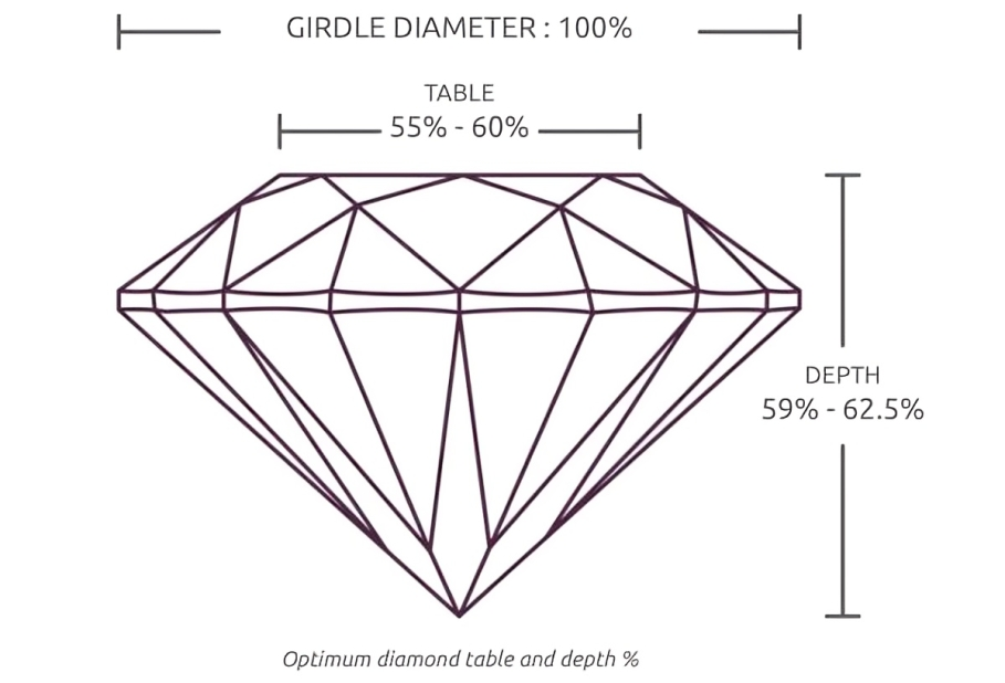 The table percentage in diamonds refers to the size of the flat, topmost facet (the table) in relation to the overall diameter of the diamond. It is expressed as a percentage and is a key factor in assessing the diamond's cut quality. The table percentage is calculated by dividing the width of the table by the average diameter of the diamond and multiplying by 100. An ideal table percentage can vary, but it is generally recommended to fall within a certain range for optimal light reflection and brilliance.